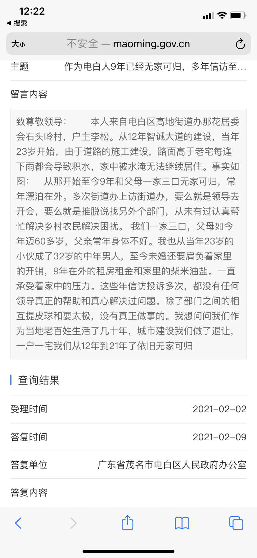 我看到以下电白区政府,电白区高地街道办的信访回复,心情复杂,难以入睡
