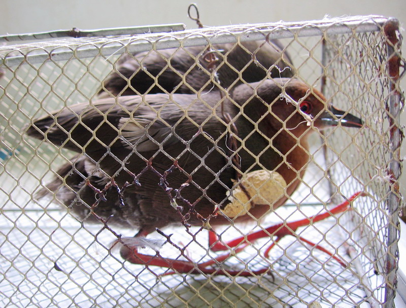 飞进家里给老爸逮到的,画眉那么大,嘴尖长,脚长,眼睛红色,没笼子装放老鼠笼里拍的照片,没拍几张见它撞笼特别厉害嘴巴都弄伤出血赶紧放飞了。