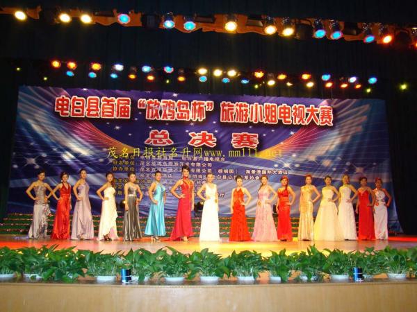历时几个月的电白县首届“放鸡岛杯”旅游小姐电视大赛总决赛于8月26日晚在电白县人民大会堂圆满降下帷幕。 在26日晚举行的总决赛上,由半决赛中脱颖而出的16名佳丽经过一番争奇斗艳,各项桂冠均已产生。本届的冠、亚、季军均由电白本地佳丽获得,她们分别是许斯慧、李敏、梁春晓,伍一丹获得“最上镜小姐”奖、谭丽婷获得“最具智慧小姐”奖。