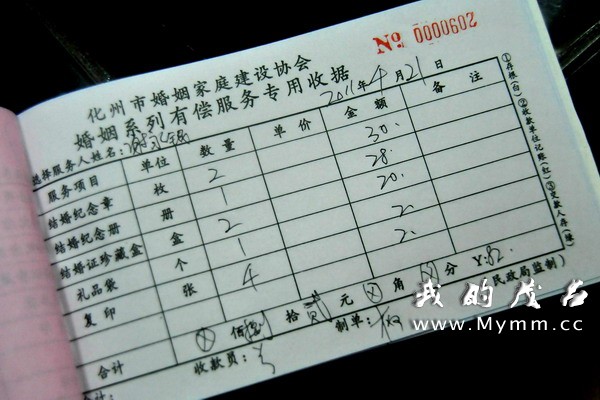 化州民政局婚姻登记处的收据显示新人登记被消费了纪念品80元