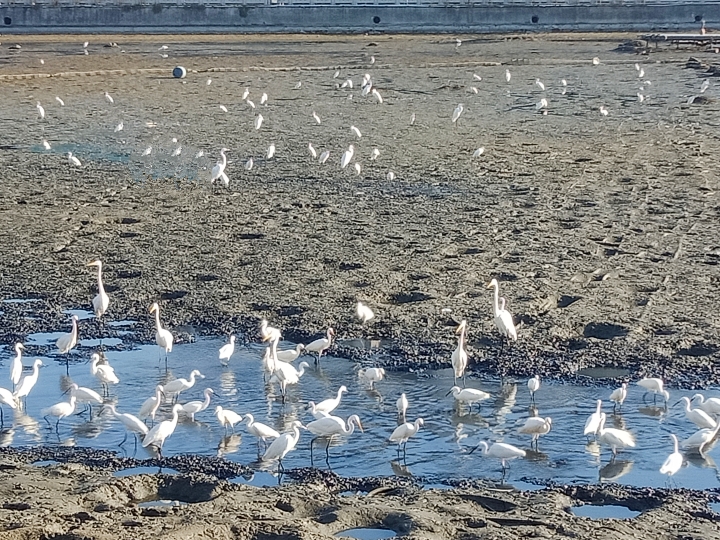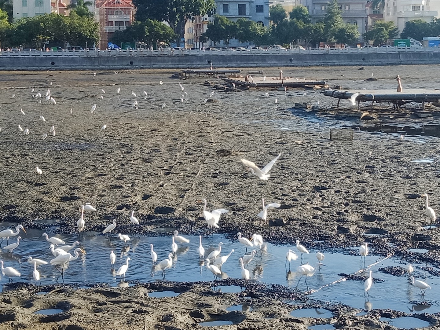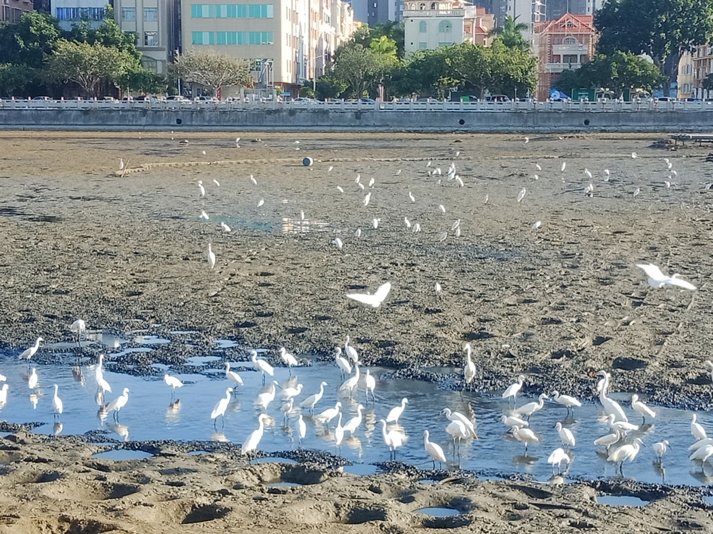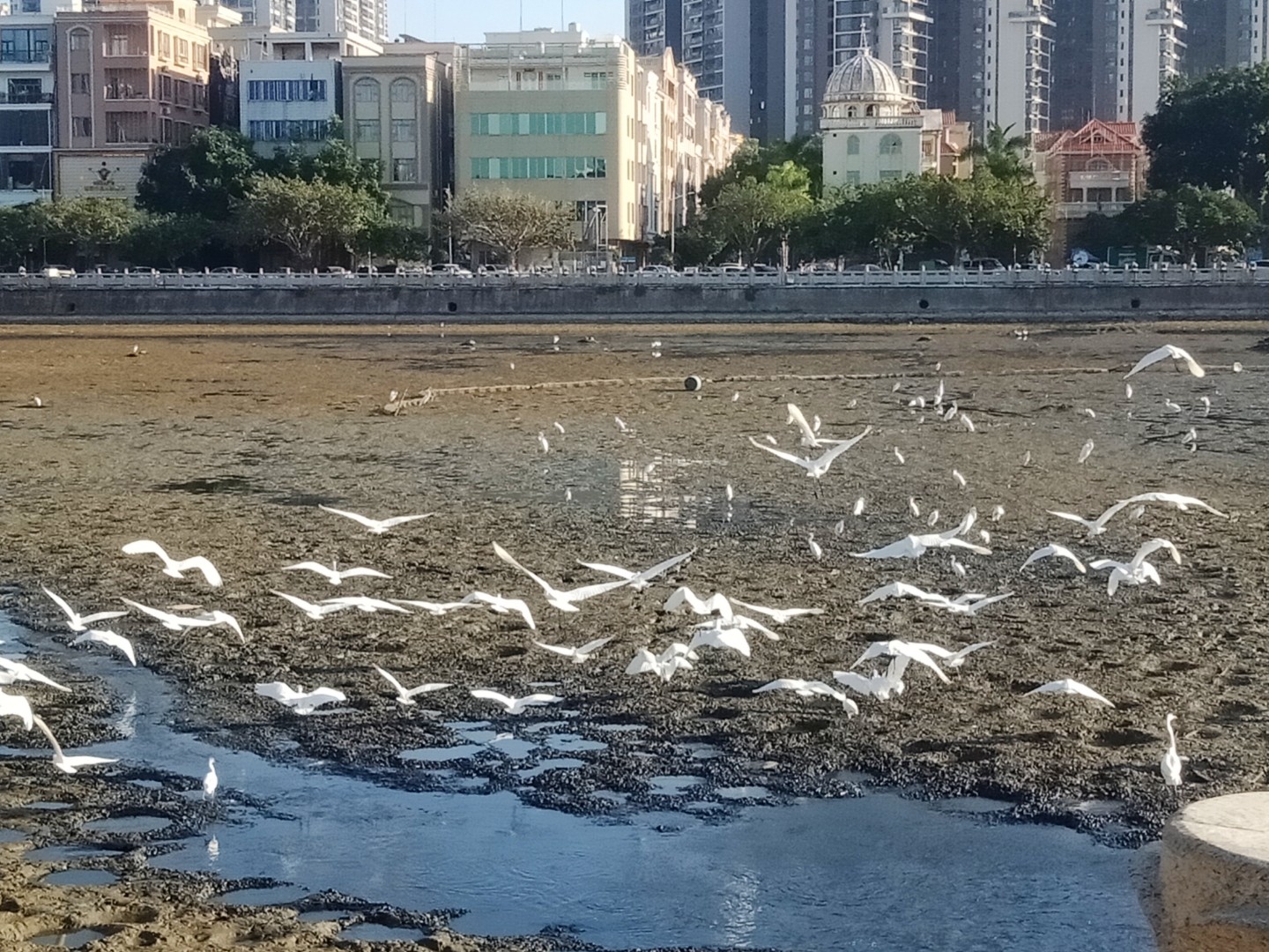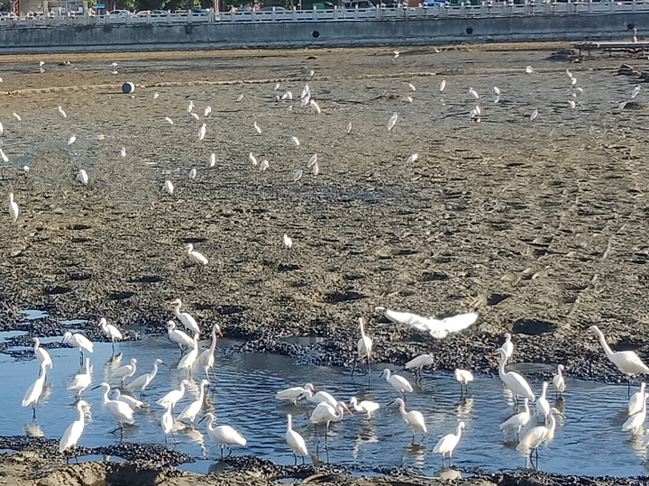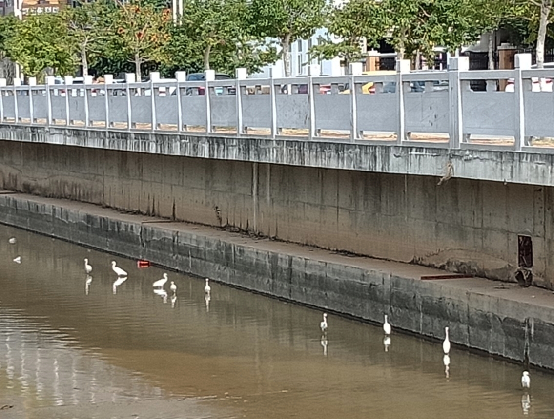 想不明白,人说人为财死,鸟为食亡,这观鹭阁对面这条排洪河,透过水面水下,左看右看,上看下看,没啥水中花水中鱼呀,不明这些白鹭与其它些鸟在这磨蹭寻觅些啥??