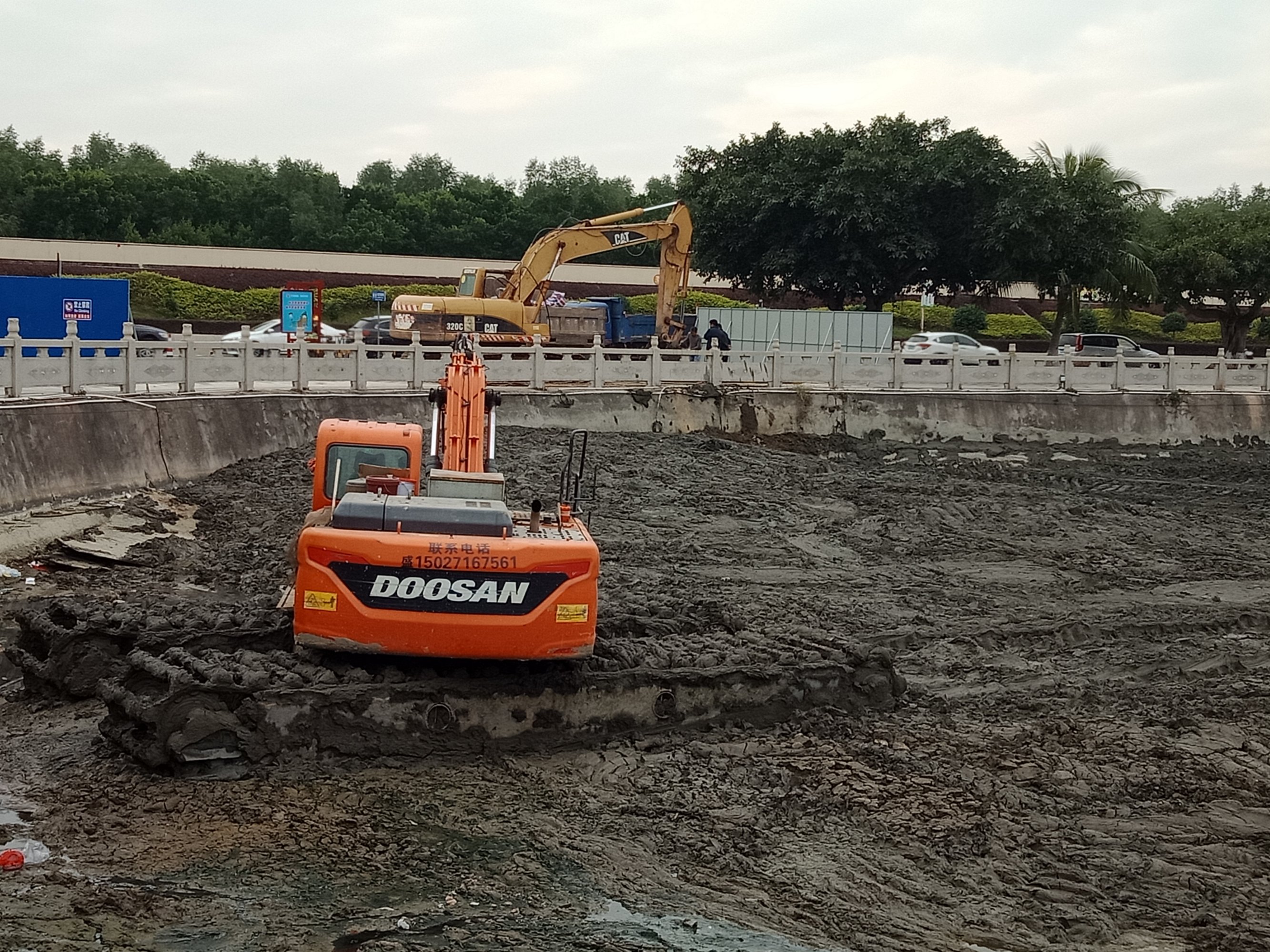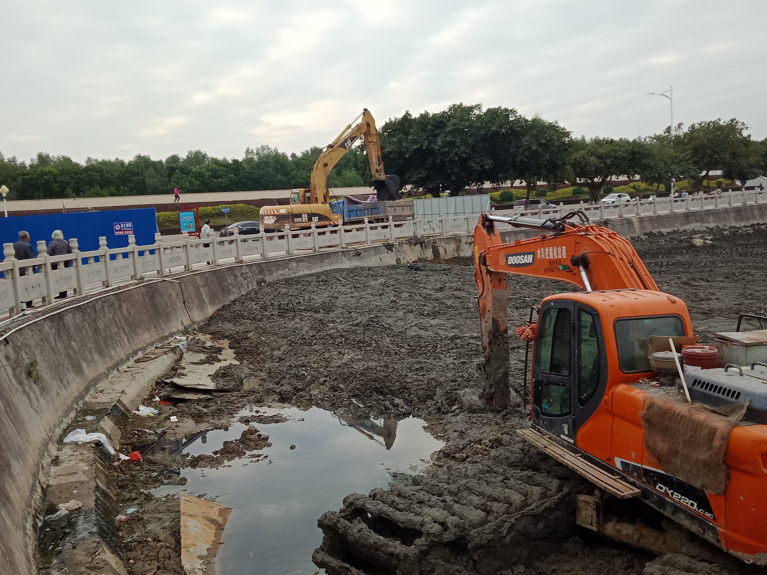东湖公园清挖淤泥装车外运,填沙石方便泥头车在淤泥中行驶。