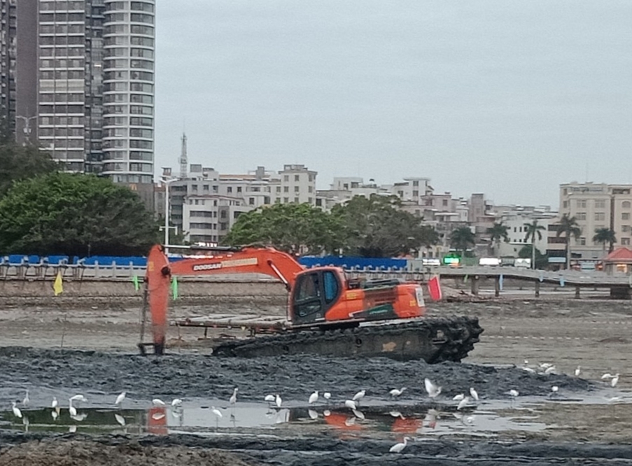 广东十佳观鸟圣地,电白水东湾红树林自然保护区今晚上珠江新闻,但在该景区最佳观鸟平台水东西湖内,地方政府正在巴掌宽的湖面上大建高楼大厦,你说奇怪不?