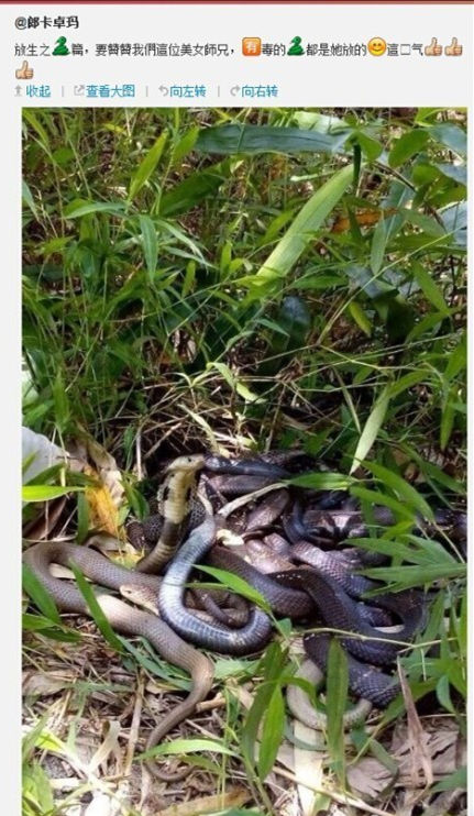 女子在公园放生眼镜蛇、狼等毒蛇猛兽(图)