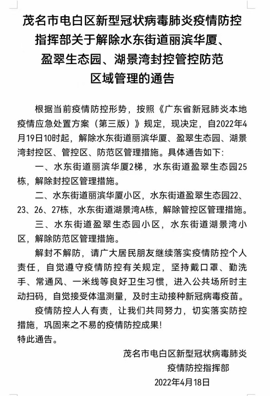 根据当前疫情防控形势,按照《广东省新冠肺炎本地疫情应急处置方案(第三版)》规定,现决定,自2022年4月18日10时起,解除水东街道海滨社区和坡心镇新河村委会封控区、管控区、防范区管理措施。具体通告如下: