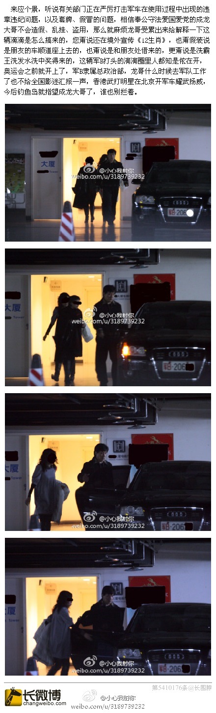 3月1日,有网友在微博和论坛上分别发布:应个景,中央严查军车私乱套盗冒用,成龙大哥受累给解释下(有图有真相)、成龙参加解放军?待遇好,一龙二凤,开A8军B等图贴,并附上4张图片,引起网路围观。 [attachmentid=309224]