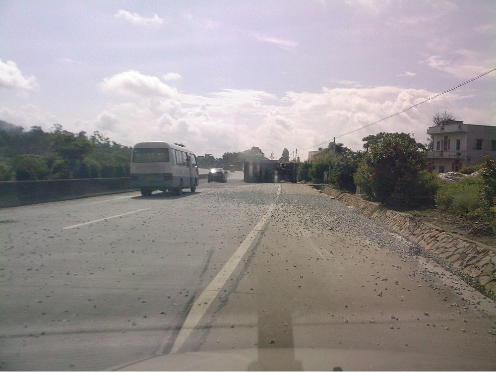 文章标题: 325国道麻岗路段超载泥头车翻车司机生死未卜