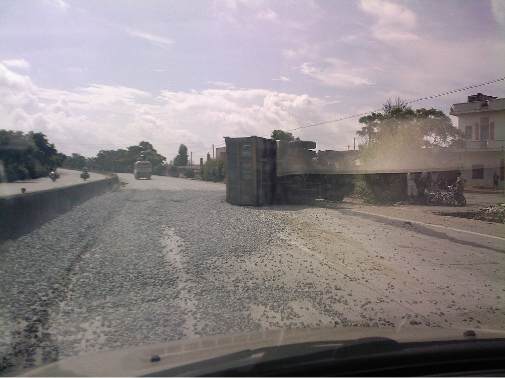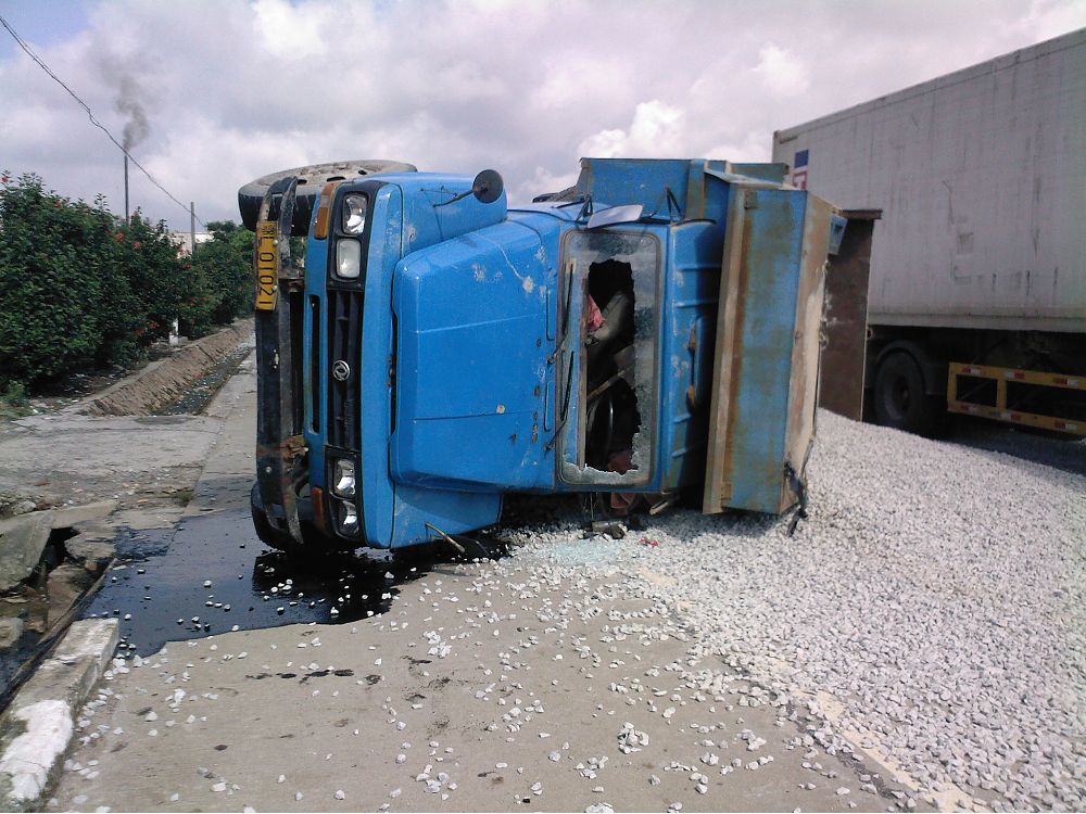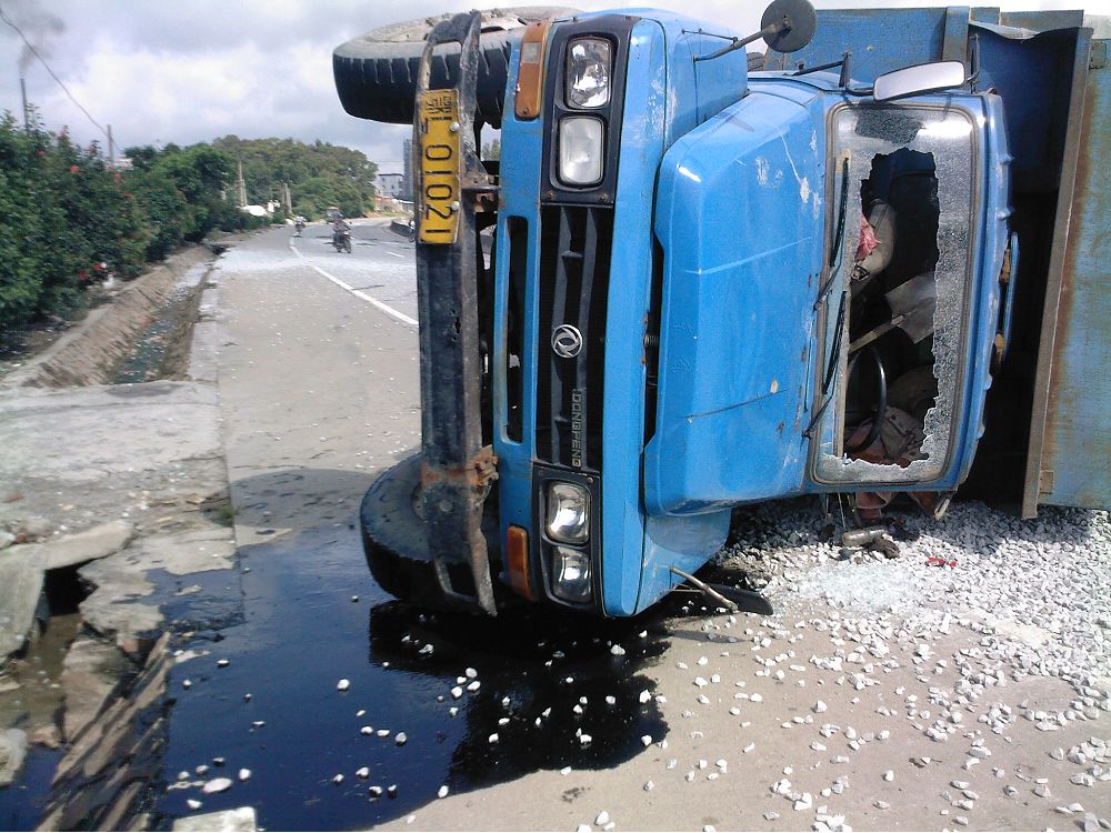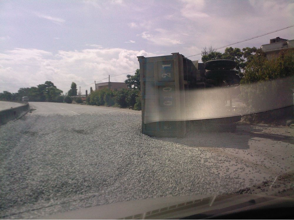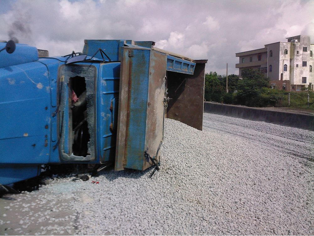 文章内容: 2009年6月18日早上9时许,一辆车牌为鄂L01021超载泥头车侧翻在325国道麻岗路段(近树仔界),满载的石子泄满国道上,泥头车驾驶室挡风玻璃严重破碎,司机送往医院生死未卜,暂时未有发现伤及路人。
