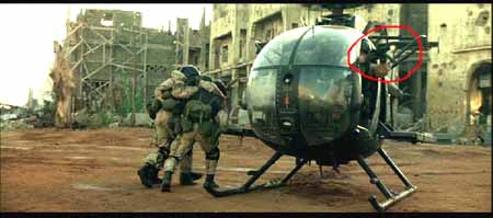 不管是电影还是当时的事实,AH-6“小鸟”和UH-60“黑鹰”上的M134为地面提供了强大的火力支援。UH-60在很多电影上都出现过,而AH-6和MH-6这两种160特遣队独家装备则是第一次在电影上露面。电影中M134的火力令人印象深刻,有很多增援的索马里武装就是在半途上被M134的弹雨所截杀,大大减轻了地面美军的压力