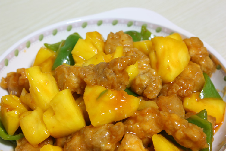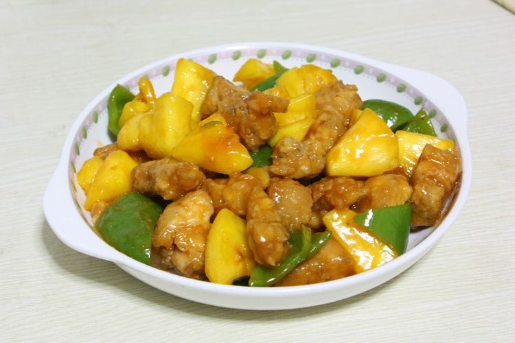 2汤匙白糖、1/2汤匙生抽煮滚,调入水淀粉勾芡,不停搅动,看酱汁变粘稠、红亮就倒入炸好的咕K肉以及菠萝和青红椒,翻炒一会