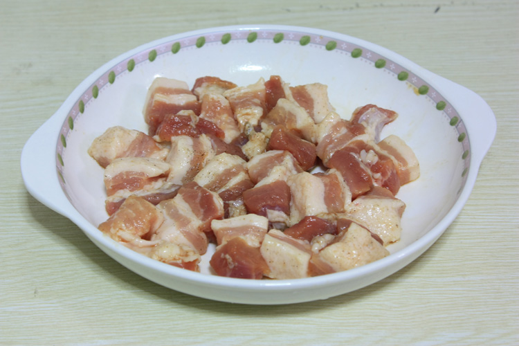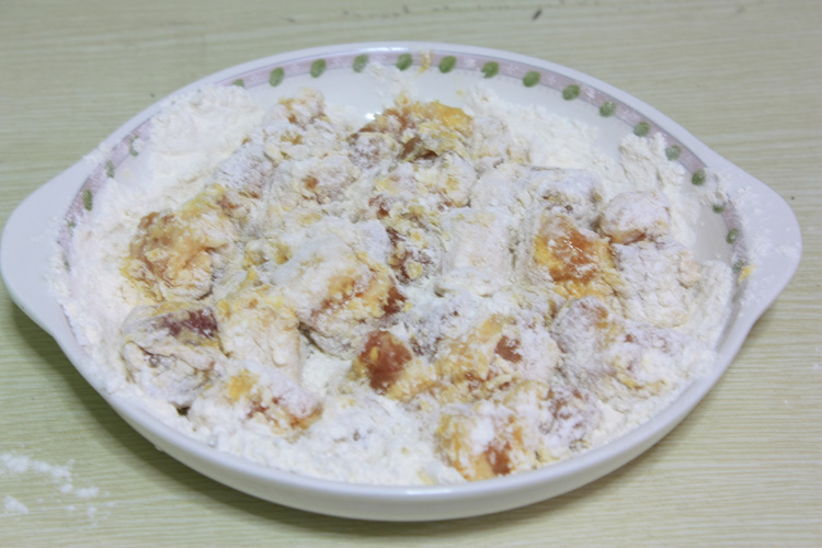 取一盘,倒入面粉,将肉块用生粉蘸均匀,然后用手捏实,也就是用手攥一下,使生粉和肉更紧实一点,