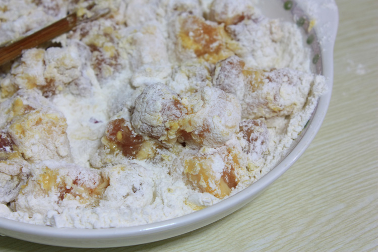 用罩筛筛去多余面粉,热锅倒入色拉油,烧至7成热,将咕K肉一块块放入,然后改中小火炸至金黄色捞出控干油