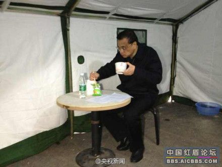 看图说话:李总理在简陋的防震棚里,一泡沫碗面、一包咸菜、一瓶矿泉水就算一餐了。