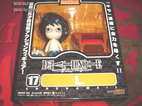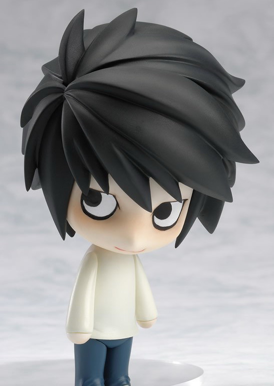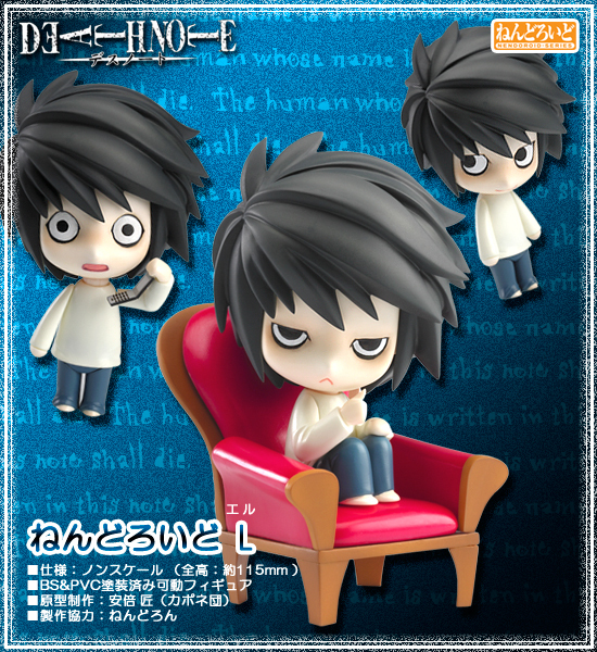 商品名:《死亡笔记》Q版L.~~PVC涂装完成品 材质:PVC~.~≈ABS 高度:11.5cm 造型师:安倍匠 制作协力:ねんどろん 生产厂商:GOOD`~SMILE..COMPANY 发售日期:07年9月 售价:3000日元