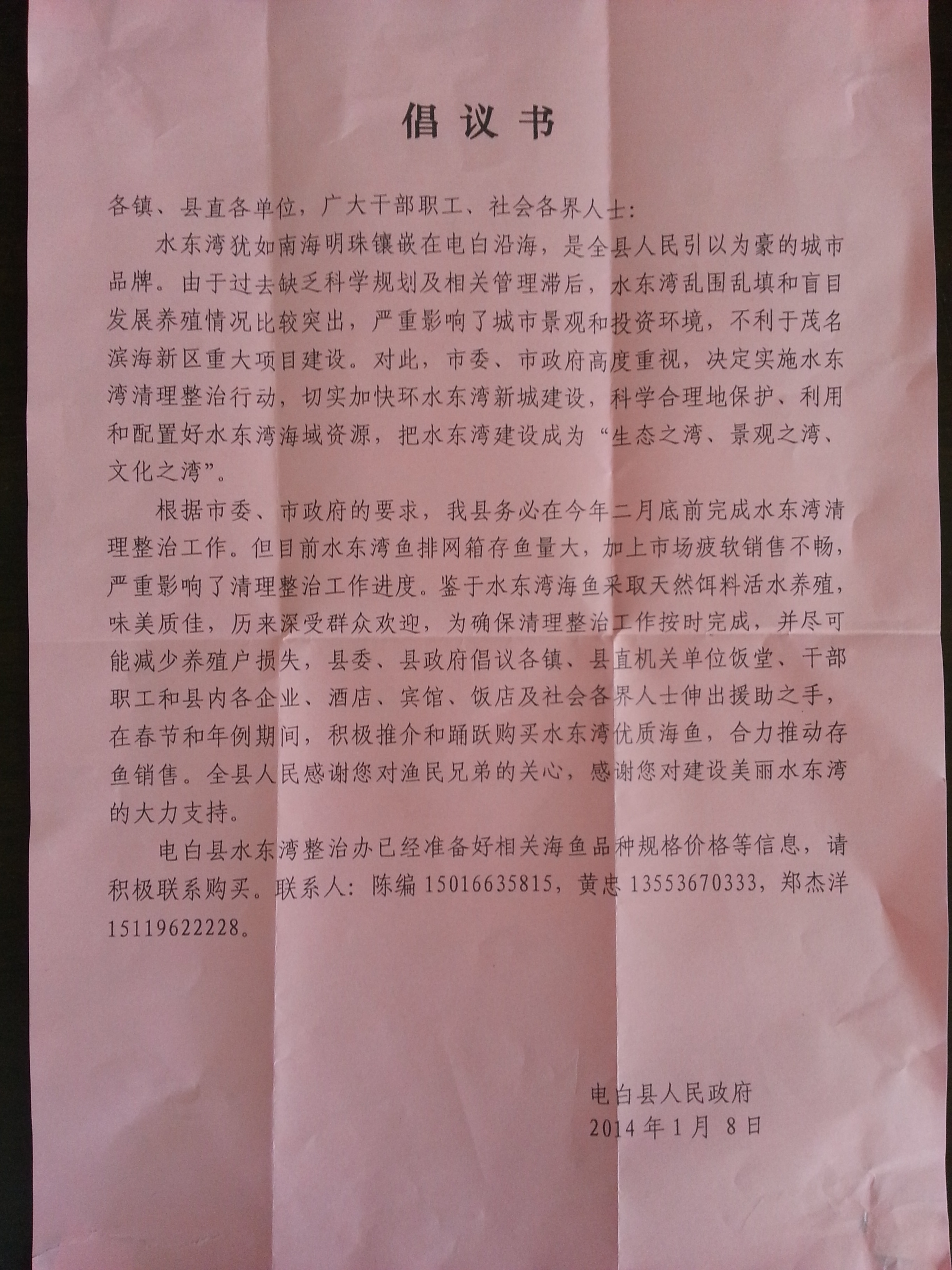 “水东湾乱围乱填和肓目发展养殖情况比较严重,严重影响城市景观和投资环境,不利茂名滨海新区重大项目建设” 人家养多少亏多少,政府出面干预,这是以行政手段干预市场规律。重点还是后面那句“严重影响城市景观和投资环境,不利茂名滨海新区重大项目建设”。2月完成?那是为了减少赔偿鱼场的损失而以政府的名义出面卖鱼了。 政府呀,政府,它总是以披着合法的外衣做着强盗的事情,比如强拆…… 希望我们的政府这次是为民做好事。哈哈,今天天气真 好。
