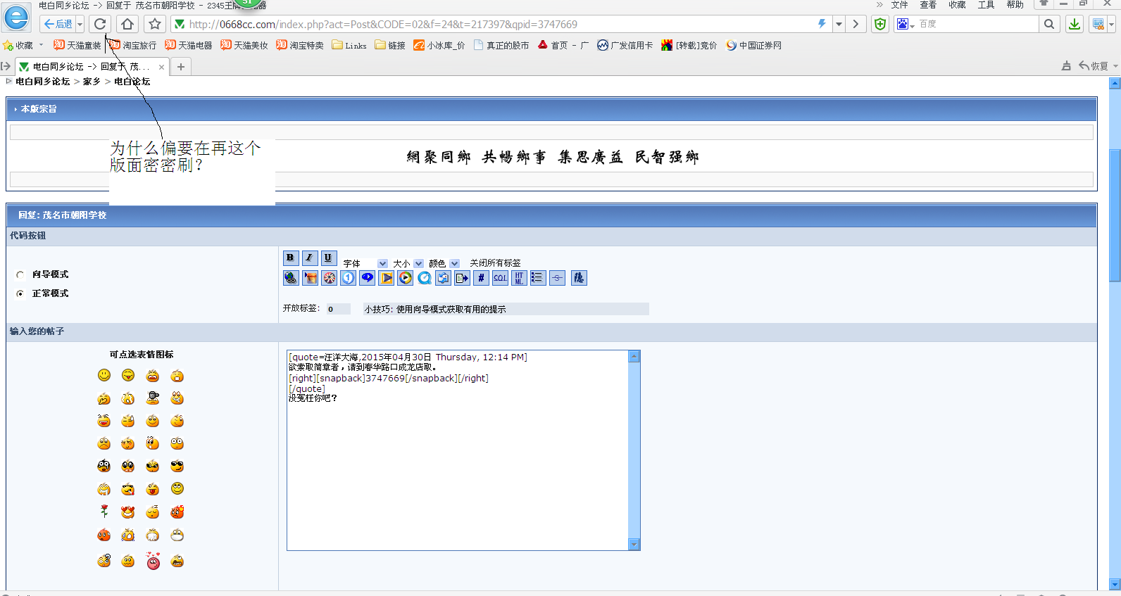 QUOTE(汪洋大海 @ 2015年04月30日 Thursday, 12:10 PM) 教育没有界线,都是为国培才,理应支持。 [snapback]3747666[/snapback] 老汪的回复数量超过5成是重发而来的,一开始以为是手机流量发帖造成,现在我不怀疑了。因我也常用流量回复,可是没他这种情况发生。有人提醒他,让他回到主版再刷屏,他不干,故意留在回复页面连刷几次,这样就接连出现几次回复。联想到他初上论坛时,ID级别每升一次,他就发主题庆贺,所以我敢确定他是有意而为。 最令人可恨的是,他顾扮委屈,说不知道什么回事造成的。