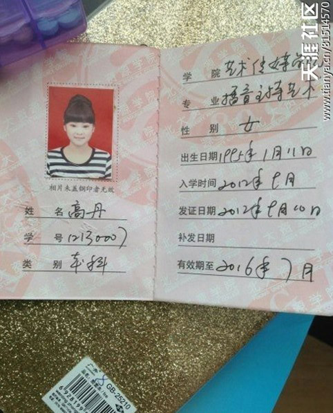 该爆料人还提供了一张学生证的照片,该照片与网帖中衣着暴露的女孩很相似,信息显示,该女孩出生于1995年,学生证显示为“播音主持艺术专业”,未写明学校。