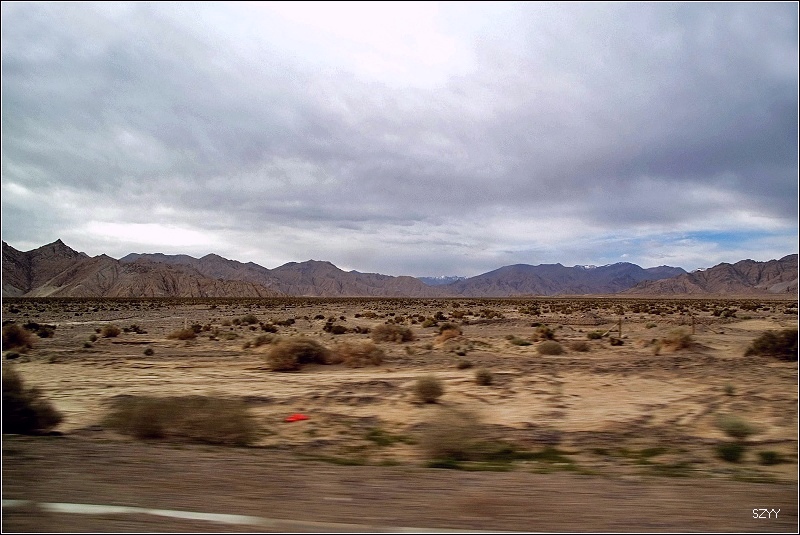 出了城,过收费站,往西宁方向,进入无人区。左侧是一望无际的柴达木盆地,右面是连绵不断的橙黄色的布尔汗布达山脉,景色极为单调乏味,除了沙漠中星星点点的红柳外,几乎没有绿色。开车很容易困乏,先是北方郎开,然后换达咏,这段路很长很长,似乎永远走不完一样,他们开车,我们就在后面睡觉,睡了几觉,醒了几次,外面的景色似乎没有任何变化,也很少看到其他车辆,就我们一辆车,孤零零地在一望无际的平原上飞驰,甚至让人产生一种幻觉,就是在玩游戏机,持续着开车的同一个姿势,一坐就是几个小时,确实很累。笔直的道路延伸到天边,车速很难控制,因为周围近处没有什么参照物,稍不小心就达到一百五六十km/h,甚至达到180km/h,也不觉得快,看看时速表,才发现,赶紧把速度降下来。
