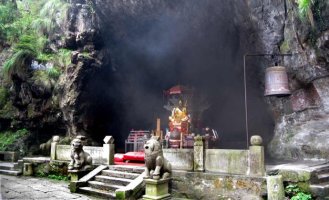 看到的仙人洞是这样的:黑咕隆咚,没有进去看,洞口香烟缭绕,游人中有