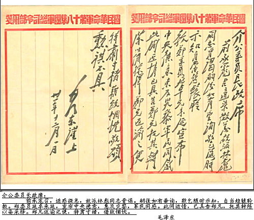 1938年9月29日,毛泽东就武汉会战致国民政府蒋委员长的一封信,盛赞政府及蒋本人之抗日决心与辉煌成就,这封由周恩来带到武汉的信件,载入人民出版社出版的《毛泽东书信选集》,全文如下: