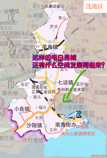 电白县城。现县城水东镇已被纳入新规划的茂名市区域,宜将电城作为新县城城址。电城位于博贺海湾边,有着显著的区位优势,325国道和高速公路横贯而过,交通极为方便。2010年建设成为25万常住人口的中等城市。镇的建设。适度加快城市重要卫星镇和重点建制镇的建设。全市建制镇81个,其中:合水、镇隆、长坡、大井、平定、合江、沙琅、博贺等8个镇要重点抓好,使之发展成为10万∽15万人口的小城市。