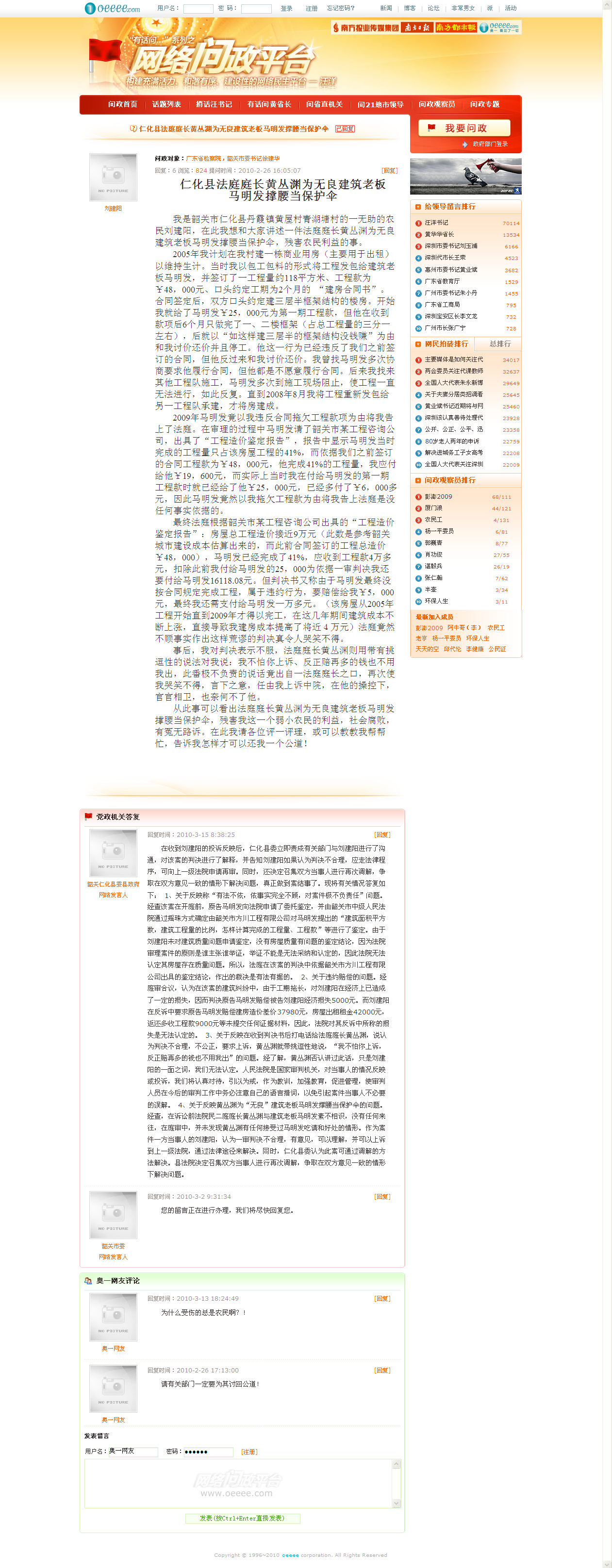 仁化县法庭庭长黄丛渊为无良建筑老板马明发撑腰当保护伞_网络问政平台_奥一网, 看见了一切.png