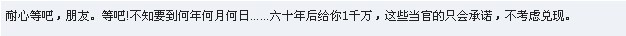 风 风花雪月 小学一年级 注册 2005-03-14 消息 128 反馈评分 0 点数 1 2005-04-08 #13 耐心等吧,朋友。等吧!不知要到何年何月何日……六十年后给你1千万,这些当官的只会承诺,不考虑兑现。