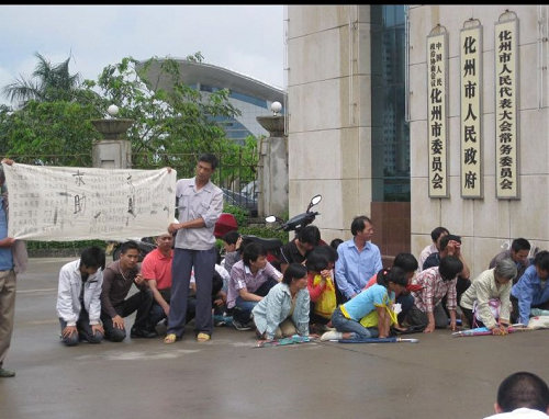 经过3个多小时的行程,村民终于来到化州市政府门前,举着横幅要求约见市主要负责人。由于没人理会,数十个村民便在市府门口两旁跪了下来,其中7个披着“冤”字白衣的村民跪在最前面。当时,天正下着雨,场面显得异常悲惨。