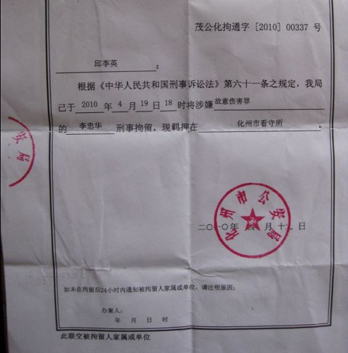 4月19日,化州市公安局对李忠华等6名梅子坑村民以涉嫌故意伤害罪进行刑事拘留。