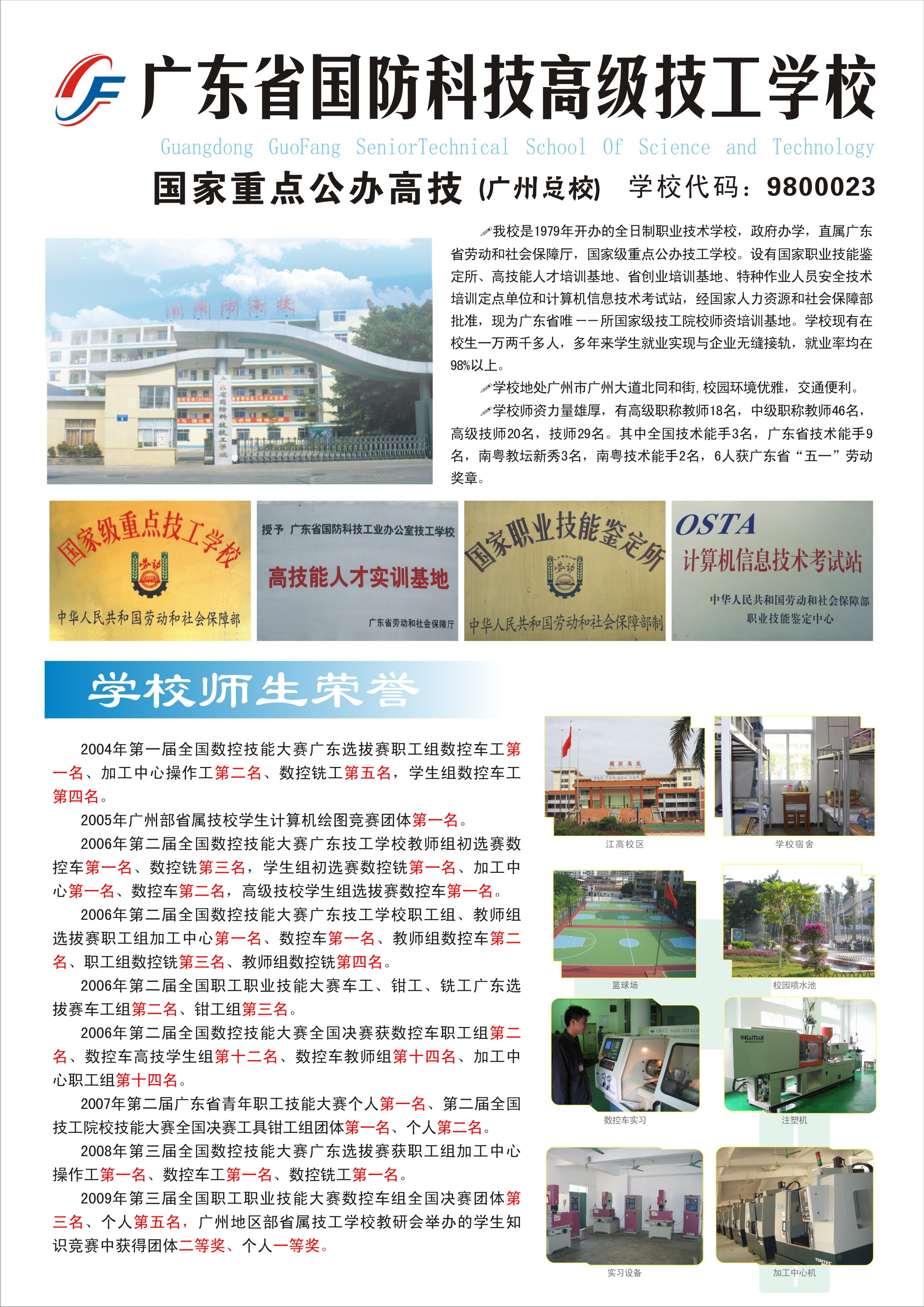 广东省国防科技高级技工学校校是1979年开办的全日制职业技术学校,政府办学,直属广东省劳动和社会保障厅,国家级重点技工学校。设有国家职业技能鉴定所、高技能人才培训基地、省创业培训基地、特种作业人员安全技术培训定点单位和计算机信息技术考试站,经国家人力资源与社会保障部批准,现为广东省唯一的一所国家级技工院校师资培训基地。学校现有在校学生一万两千多人,多年来学生就业与企业无缝接轨,就业率达98%以上。