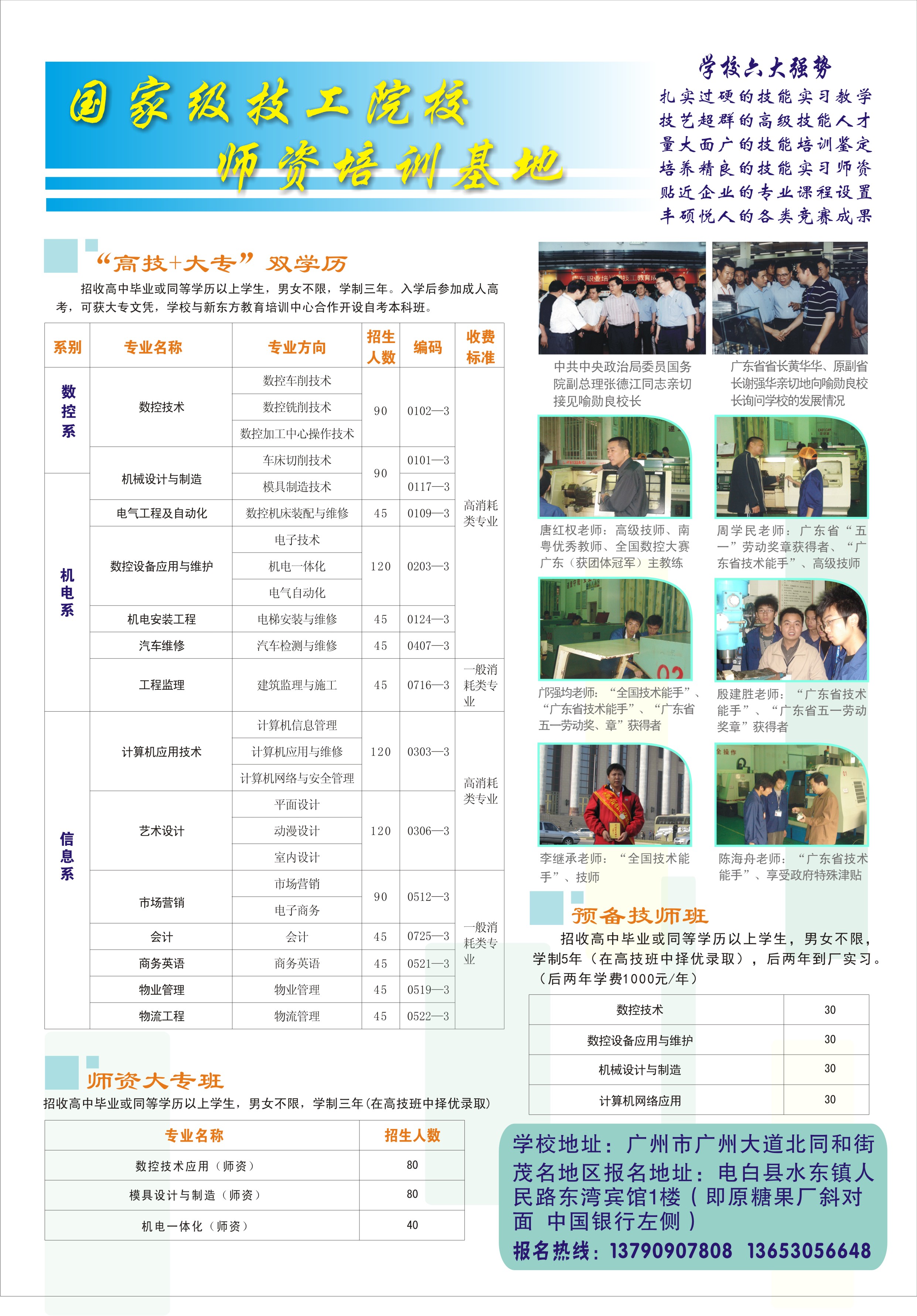 学校有与所开设专业相配套的师资队伍,力量雄厚,高级职称教师39名,中级职称教师46名,高级技师、技师94名。配置有现代化的教学设备和实习设施:有计算机中心及多媒体教学中心、加工中心车间、数控铣床车间、数控车床车间、普通车床车间、模具制造车间、电工电子车间、家电与制冷车间、钳工车间、PLC可编程实习室和机械实验室等供学生实习。