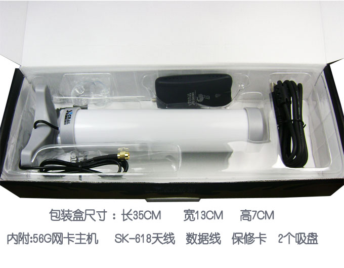 SK厂商新推出的这款火影56G,天线是采用10DB防水定向天线(也是唯一一款原装防水天线),网卡功率达到1500WM,信号强度超过雷达天线的网卡。必竟好货便宜不了,请您不要拿几十块钱的网卡和我们做对比,那根本就不在一个挡次,光这根天线的成本就足抵他们整套设备的成本。