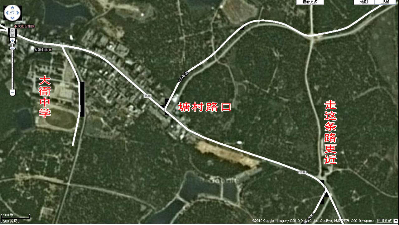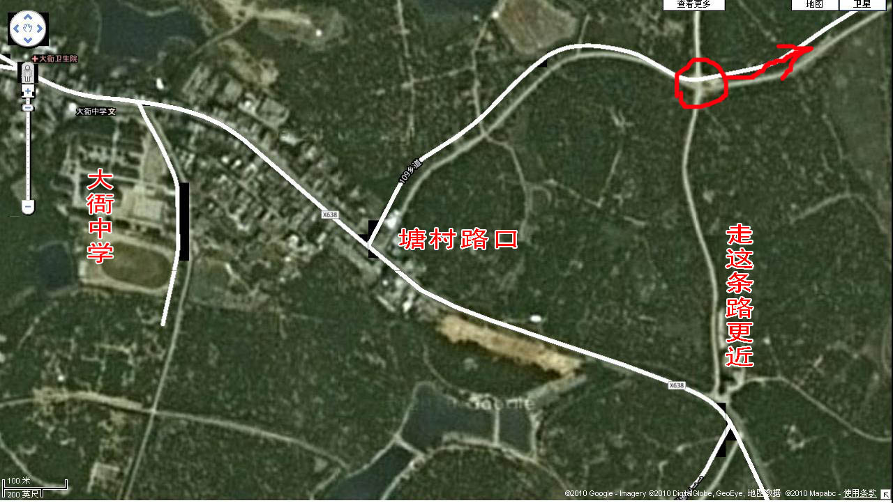 如果从麻岗出发,即将到大衙前有个大的左转弯,在转弯处向北有条捷径,如图: