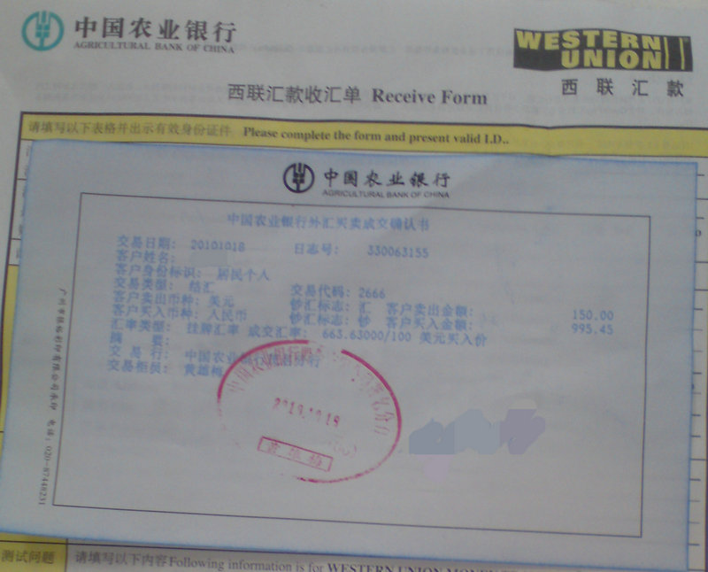 还有今日去了农业银行,收到并把论坛爱心网友 山野林泉 汇入的150美金兑换为人民币,合共995.45元(为便于记录,我们记为1000元)