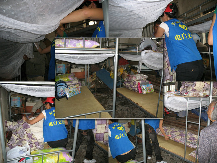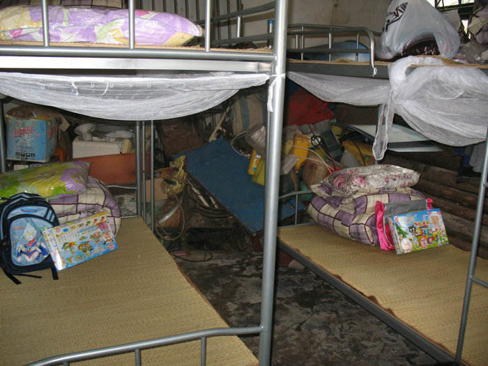 义工联同下海小学领导班子,校长主任一起把严彩霞一家原来的地板床清理干净,安置上由网友们捐赠的铁架床