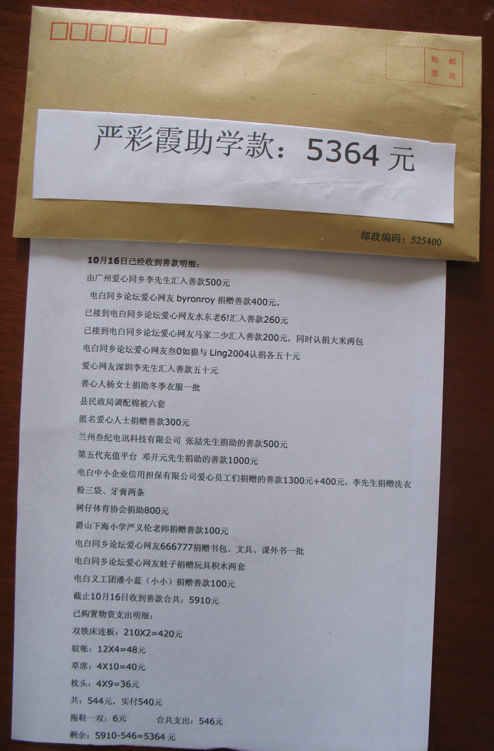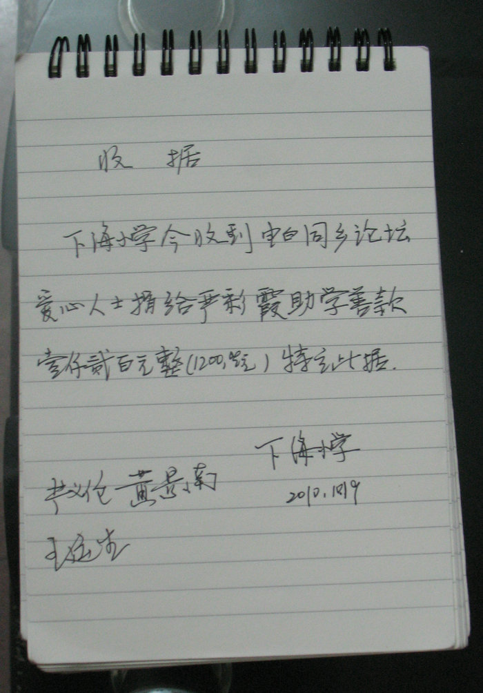 10月19日我们转交了由论坛爱心网友 山野林泉、叁0如狼、LIANG2004捐赠的助学款合共1200元