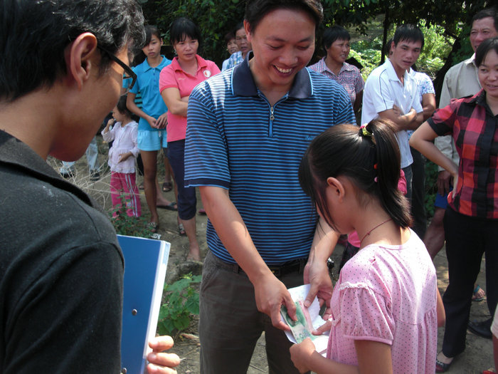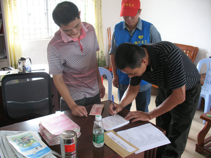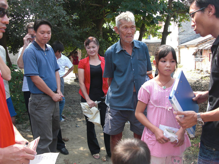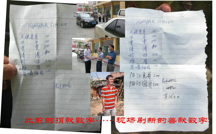 10月23日,爱心人士良哥、海哥从阳江赶赴电城与我们会合,并送上700元的慰问金。联同茂名与阳江两地的爱心网友、"同城朋友群"、"牛群"两大QQ群的爱心代表探望严彩霞一家,并送上3570元慰问金及助学款