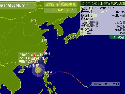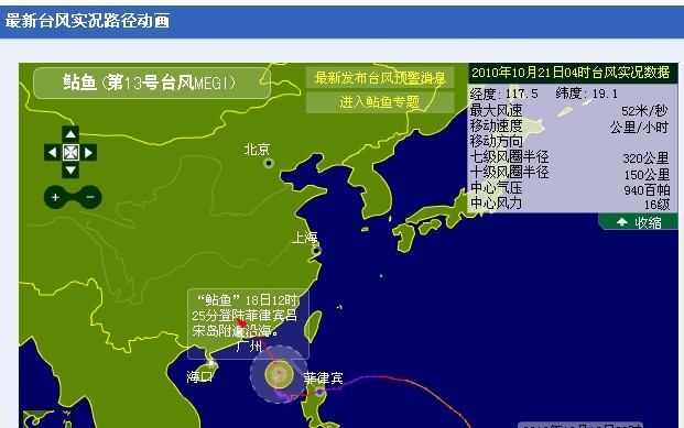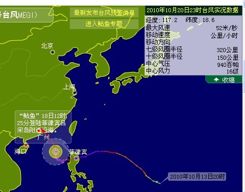 中新社广州10月20日电 (唐贵江 董永春) 今年第13号超强台风“鲇鱼”20日继续以每小时10公里的速度向广东中部沿海地区逼近,并可能于23日在这一带沿海地区登陆,登陆时强度估计为强台风,将对广东造成严重影响,到20日中午12点,该省包括广州、深圳、珠海在内的沿海38县市纷纷拉响台风警报。【详细】