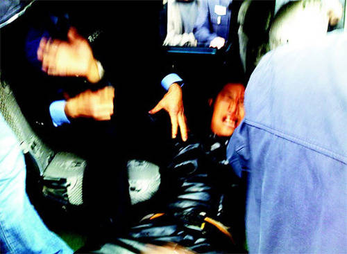 当日14时20分左右,记者路经乾县东大街时,见5名城管拦住一辆三轮摩托车,正在争吵,其中一未穿制服男子手指司机态度蛮横,其他4名穿制服城管队员将司机团团围住,并有撕扯现象。记者当即停车,等记者及围观群众赶到现场时,“三摩”司机已被城管强行拉上了一辆车号为陕D-32636深绿色面包车内。此时“三摩”司机已经被打得满脸是血,身上穿的黑色皮衣皮裤到处都是泥土,上半个身体仍躺在城管执法车的车厢里,双手被车厢里的城管死死地拽住,未穿制服的男子还在继续向“三摩”司机拳打脚踢。不大的车厢里同时容纳了两名执法人员,其他执法人员则都紧紧挡在面包车门前。在记者和围观群众的强烈谴责声中该城管才停止了殴打并迅速撤离现场。14时35分乾县110赶到。110巡警迅速拨打了120急救电话,围观群众协助医护人员把伤者送往医院救治。