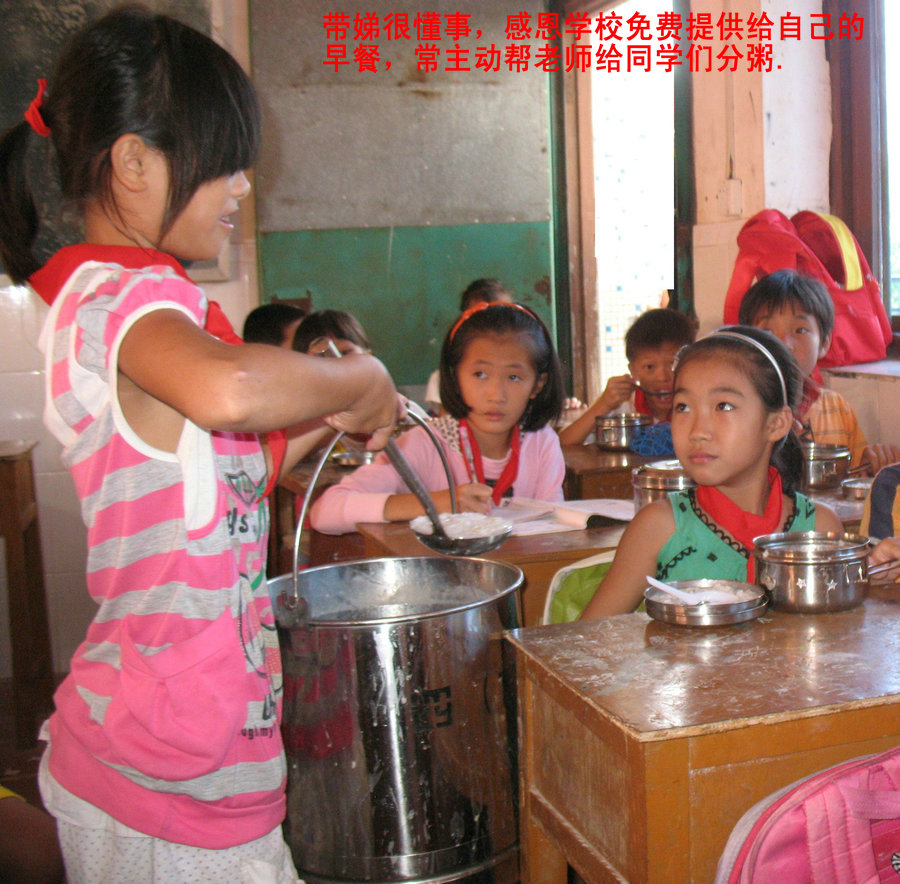 而后我们到严明珍所在学校了解到,严明珍小学毕业的成绩已达到了电海中学(省一级中学)的录取线,因家里经济贫困而没能如愿,加之担心父亲年迈多病无人照料,妹妹尚幼无人照顾,在下海小学学校领导的帮助下,严明珍进入了爵山中学的尖子班并争取了一个学期100元的特困生补助,虽是离家最近的一所中学,但严明珍也是该学校离家最远的一名学生,每天她需花费两个多小时,骑着自行车来回20公里上学,因所住地离学校较远而没能参加晚自修,晚上回去还要在理发店帮忙,安排自修复习的时间因此减少,成绩有所下滑,感觉很是吃力。言谈中,明珍对学习抱有强烈的愿望,对自己的成绩下滑充满无奈与深具无助感,她希望能有更多的时间投入到学习中去。妹妹严带娣,下海小学领导为其免除了所有的书杂费才得以继续上学,同时懂事的带娣,为感激学校免费为其提供的早餐,她在学校每天都会主动协助老师给同学们分配早餐。