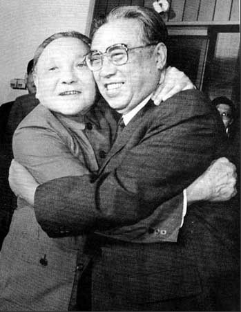 1982年邓小平同志接见来访的朝鲜劳动党总书记金日成热烈拥抱。