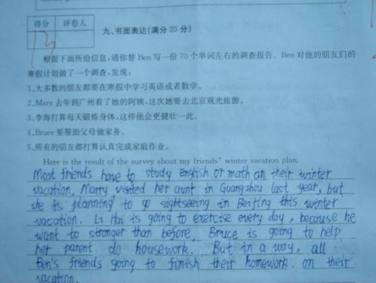 初中英语作文还是比较简单的,能完成这几句话的中译英,不出现太多的语法错误,字数够,卷面清楚都能拿九成分左右的。我估计那个评卷老师根本不看内容就打分了。好在是期末考试,如果是中考高考碰到这些老师改卷,真的是误人一生。
