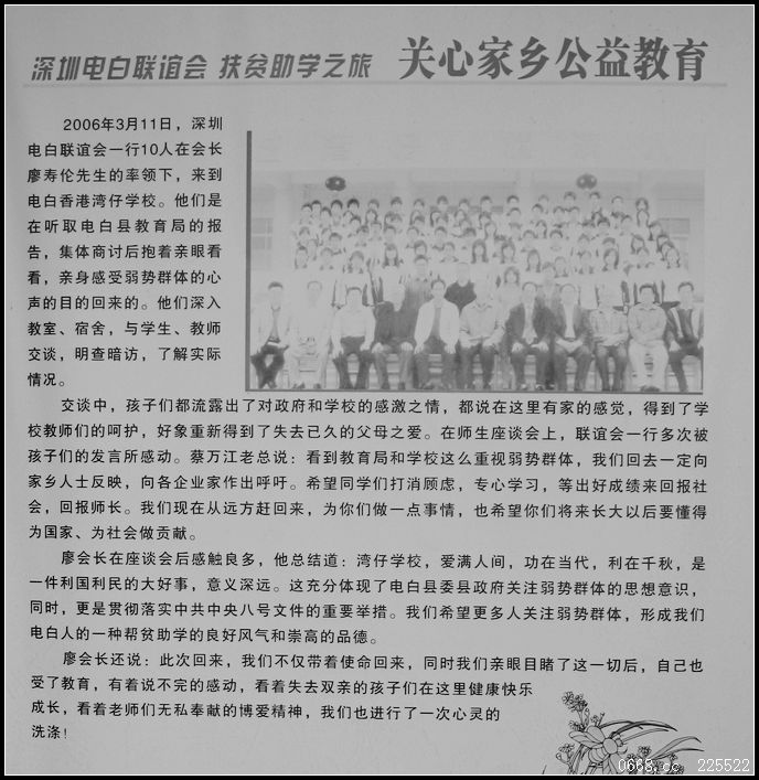 4月3日下午2点半左右,由深圳电白同乡会2011年度执行会长邵天胜老板牵头,组织深圳电白同乡会常务副会长、副会长、有爱心的企业家乡贤,慰问电白县湾仔孤儿学校。