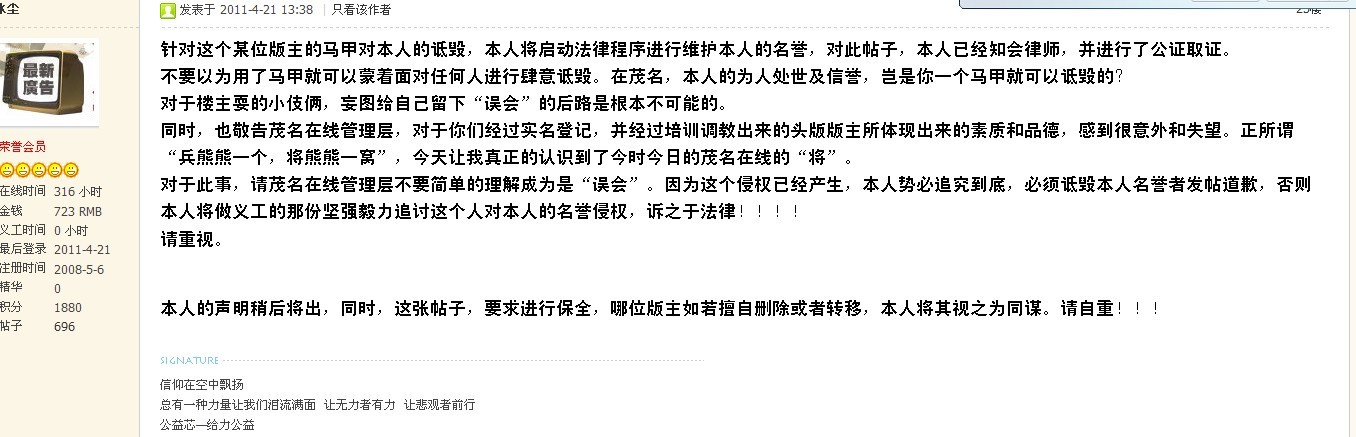 对于此事,请茂名在线管理层不要简单的理解成为是“误会”。因为这个侵权已经产生,本人势必追究到底,必须诋毁本人名誉者发帖道歉,否则本人将做义工的那份坚强毅力追讨这个人对本人的名誉侵权,诉之于法律!!!!
