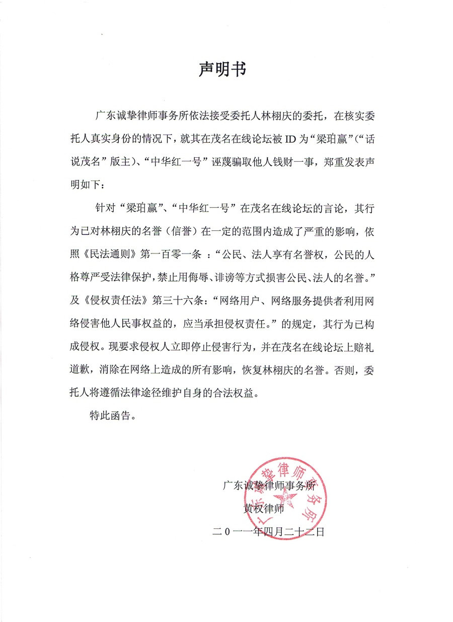 感谢大家的关注!在茂名在线受到一版主针对本人的屈辱不小,个人决定通过法律手段进行追索,以维护个人名誉。