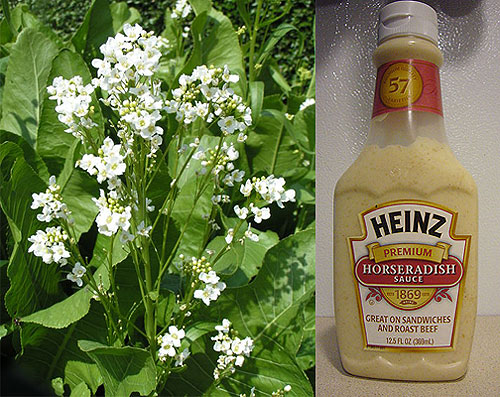 知道了此芥末酱非彼芥末酱,现在再告诉你一个不幸的消息:真正的山葵根是很昂贵的,哪家寿司店也不可能随手给你两包免费吃喝,所以你所体验的那种冲鼻涨脑的自虐感,其实来自于另一种十字花科的植物――辣根( Armoracia rusticana )。