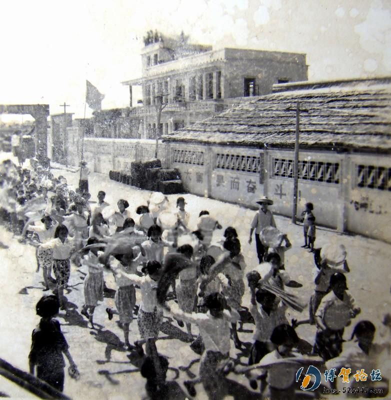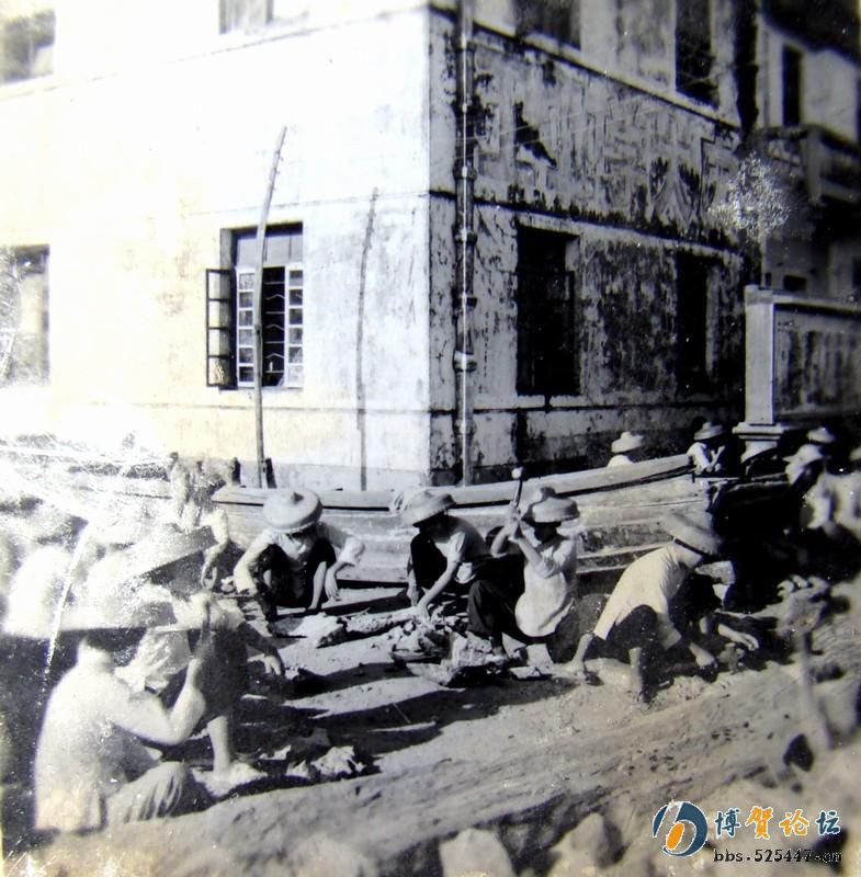 图为水东粮管所工地。水东人民每月凭粮簿到该所买米,定量小孩22斤,工