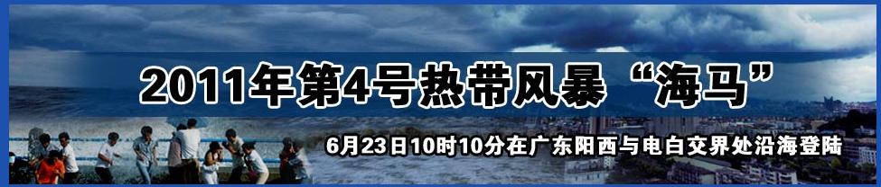 [attachmentid=263781] 中央气象台23日10时15分发布台风登陆消息: 今年第4号热带风暴“海马”的中心已于23日10时10分在广东省阳西县与电白县交界处沿海登陆,登陆时中心附近最大风力有8级(20米/秒),中心最低气压为990百帕。预计,“海马”将以每小时15公里左右的速度向西偏北方向移动,以后转向偏西方向移动,强度缓慢减弱。