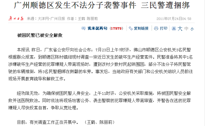 广东顺德陈村发生警民冲突事件,当地村民因不满土地被贪官私下出租,连日进行维权行动。23日三名到场处理土地纠纷的便衣公安,即被村民用绳困绑在被推翻的客货车上,并淋上汽油,有人更点火欲烧死三人。之后,当局调派大批公安、武警到场,开水炮将火淋熄及驱赶村民,终将三名公安抢出。