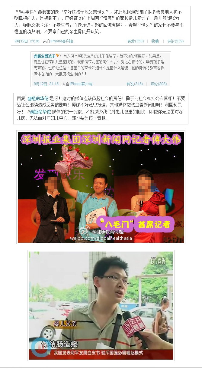 廖新波还爆料称,深圳妇儿医院一名新生儿因患有不全性肠梗阻而导致腹胀,医生会诊后建议其进行结肠造瘘手术,但其家属看了媒体关于“8毛钱”的报道,一口拒绝手术建议后带孩子回家,次日晚急诊入院,肠道已经穿孔需要进行急诊手术。他说:“肠穿孔之后进行治疗的费用,比人工造瘘手术的费用还要高”。